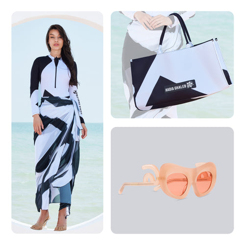 Swim in style, step out complete. This full set includes swimwear, tote bag, sunglasses, a breezy kaftan, and matching men’s shorts—everything you need for the ultimate beachside moment.